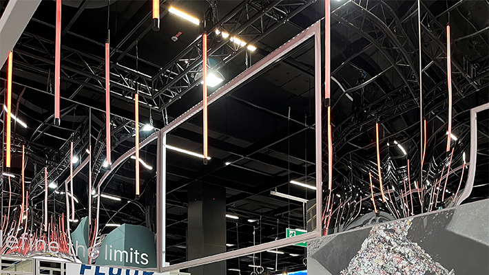 De hangende Aluvision frames zijn namelijk aan de binnenzijde voorzien van spiegelplaten. In combinatie met de LED staven geeft dit een prachtig en opvallend effect. Verder is de stand aangekleed met peesdoeken voor in de frames van Aluvision. De blackback doeken in zowel de staande frames op de grond als in de hangende eyecatcher in de lucht (buitenzijde) passen perfect.